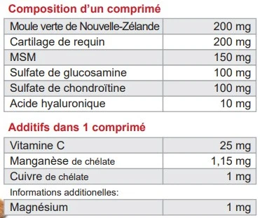 La palourde de Nouvelle-Zélande (Perna canaliculus) contient : GAG (glycosaminoglycanes) – un composant du cartilage et du liquide synovial, acides gras oméga 3 (EPA, DHA, ETA).