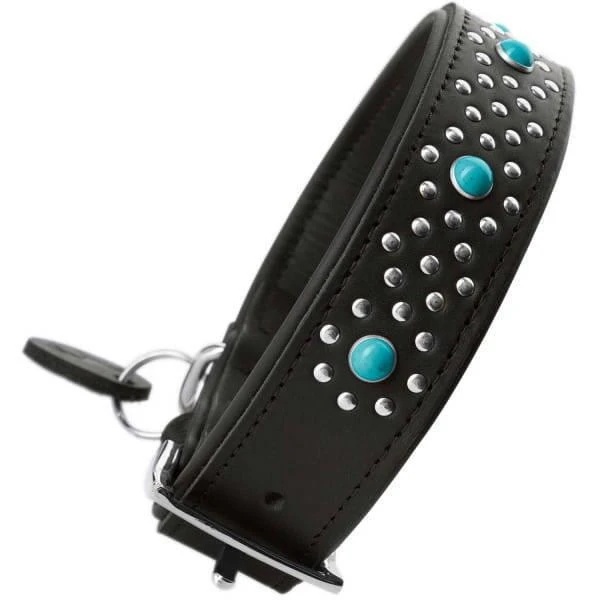 La décoration sous forme de rivets et de pierres précieuses donne au collier un aspect très intéressant et unique.