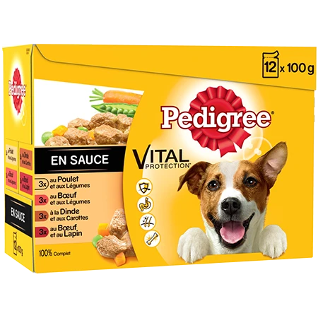 Pedigree Vital Protection est spécialement formulé pour répondre aux quatre besoins nutritionnels clés de votre chien afin de l’aider à rester en bonne santé et à conserver sa vitalité. La vitamine E aide à soutenir le système immunitaire afin que votre chien soit toujours prêt à affronter n’importe quoi. Le zinc et l’huile de tournesol, qui contient des acides gras oméga-6, favorisent la santé de la peau et du pelage. Les fibres naturelles aident à maintenir un système digestif sain pour que votre chien se sente toujours au mieux. Le calcium favorise la santé des os. Sans sucre ajouté. Idéal pour un repas frais qui répond à tous les besoins nutritionnels de votre chien. Il suffit d’ouvrir le sachet et de le servir à votre chien.