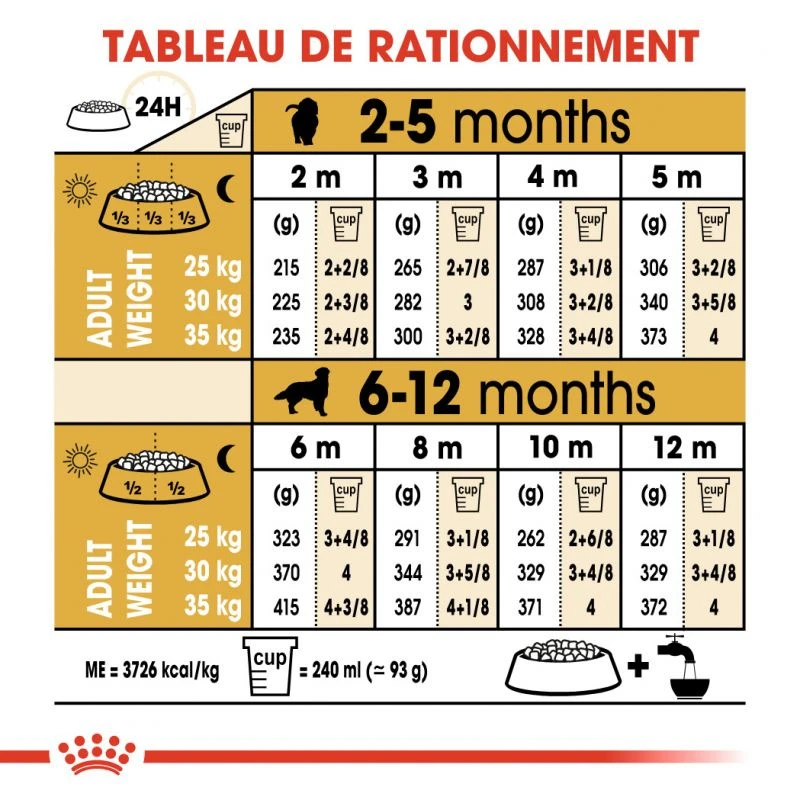 L’aliment ROYAL CANIN Golden Retriever Puppy a été spécialement conçu pour les chiots golden retrievers jusqu’à l’âge de 15 mois. Pendant la période de croissance, le système immunitaire se développe progressivement. C’est pourquoi les aliments ROYAL CANIN Golden Retriever Puppy contiennent un complexe breveté d’antioxydants en interaction pour soutenir les mécanismes de défense naturels du chiot. Les aliments ROYAL CANIN pour chiots Golden Retriever contiennent également un complexe unique d’ingrédients qui favorisent une peau saine et un beau pelage.