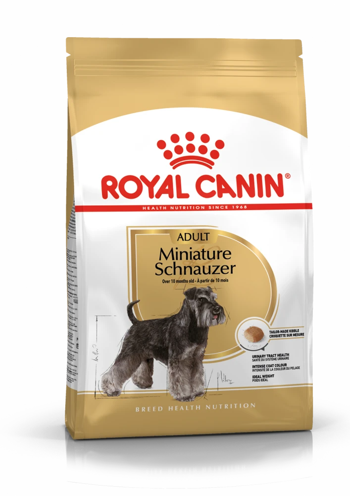 ROYAL CANIN Miniature Schnauzer Adult, pour les races petites et miniatures dédié au Schnauzer miniature de plus de 10 mois, a été spécialement développé pour répondre aux besoins de votre chien adulte. La recette ROYAL CANIN Miniature Schnauzer Adult contient des nutriments qui favorisent la santé des voies urinaires. Il augmente également la consommation d’eau de votre chien, ce qui contribue à protéger sa santé urinaire. Les aliments pour chiens adultes ROYAL CANIN Miniature Schnauzer contiennent des niveaux optimaux d’acides aminés spécifiques responsables de la couleur intense du poil chez les chiens de différentes couleurs. Les aliments conviennent aux chiens ayant des pelages différents.