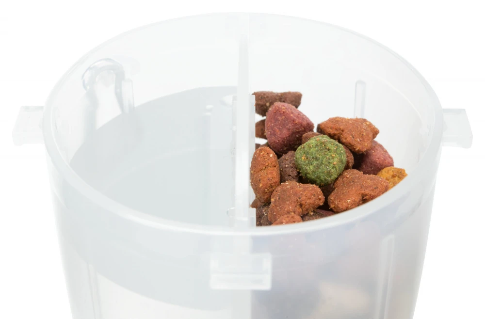 La bouteille a deux sections, de sorte qu’un compartiment est destiné à l’eau et l’autre à la nourriture, et un petit bol de voyage est inclus. Les ouvertures séparées vous permettent de choisir le compartiment que vous souhaitez vider. Grâce au bol inclus, vous pouvez facilement donner de la nourriture ou de l’eau à votre animal en voyage. Grâce au crochet, vous pouvez facilement l’accrocher à votre sac et l’emporter avec vous en voyage, à vélo ou lors de longues promenades.