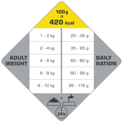 85 % des protéines présentes sont d’origine animale et, en combinaison avec du riz, celles-ci assurent une digestion facile et une bonne consistance des excréments. La composition extrêmement savoureuse est sans gluten et ne contient donc ni blé ni maïs. Le risque d’allergies alimentaires ou d’intolérances s’en trouve ainsi réduit.