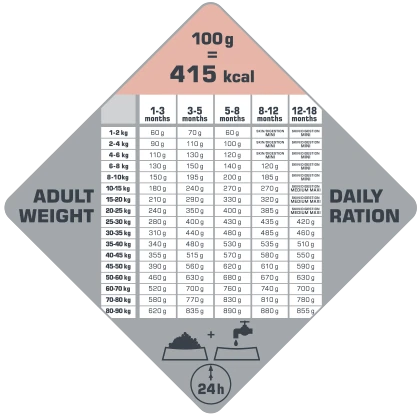 80 % des protéines présentes sont d’origine animale et, en combinaison avec du riz, celles-ci assurent une digestion facile et une bonne consistance des excréments. La composition extrêmement savoureuse est sans gluten et ne contient donc ni blé ni maïs. Le risque d’allergies alimentaires ou d’intolérances s’en trouve ainsi réduit.